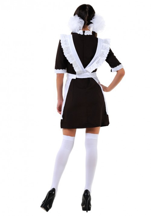 Комплект состоит из клас­си­че­ского корич­не­вого пла­тья с белым ворот­нич­ком и бело­снеж­ного фартука!