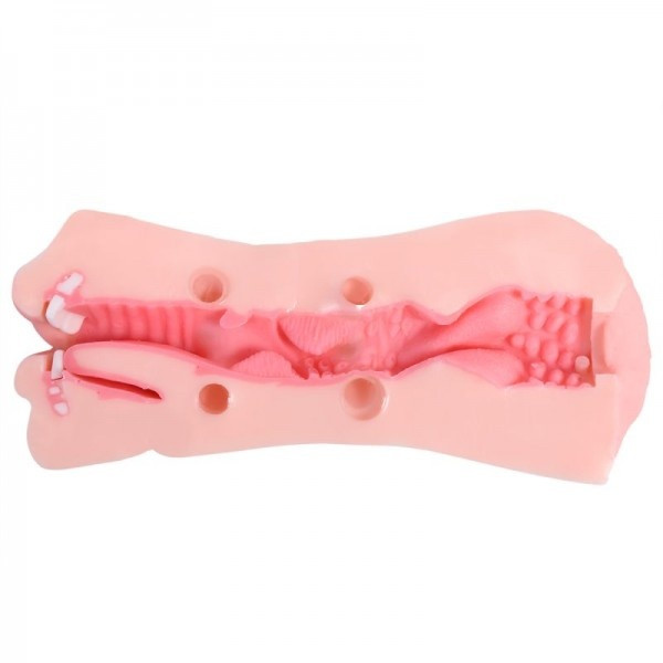 Мастурбатор с одной стороны представлен "сочной" вагиной с ярко выраженными половыми губками, с обратной стороны реалистичный приоткрытый ротик с очерченными зубками и язычком жаждет проникновения!